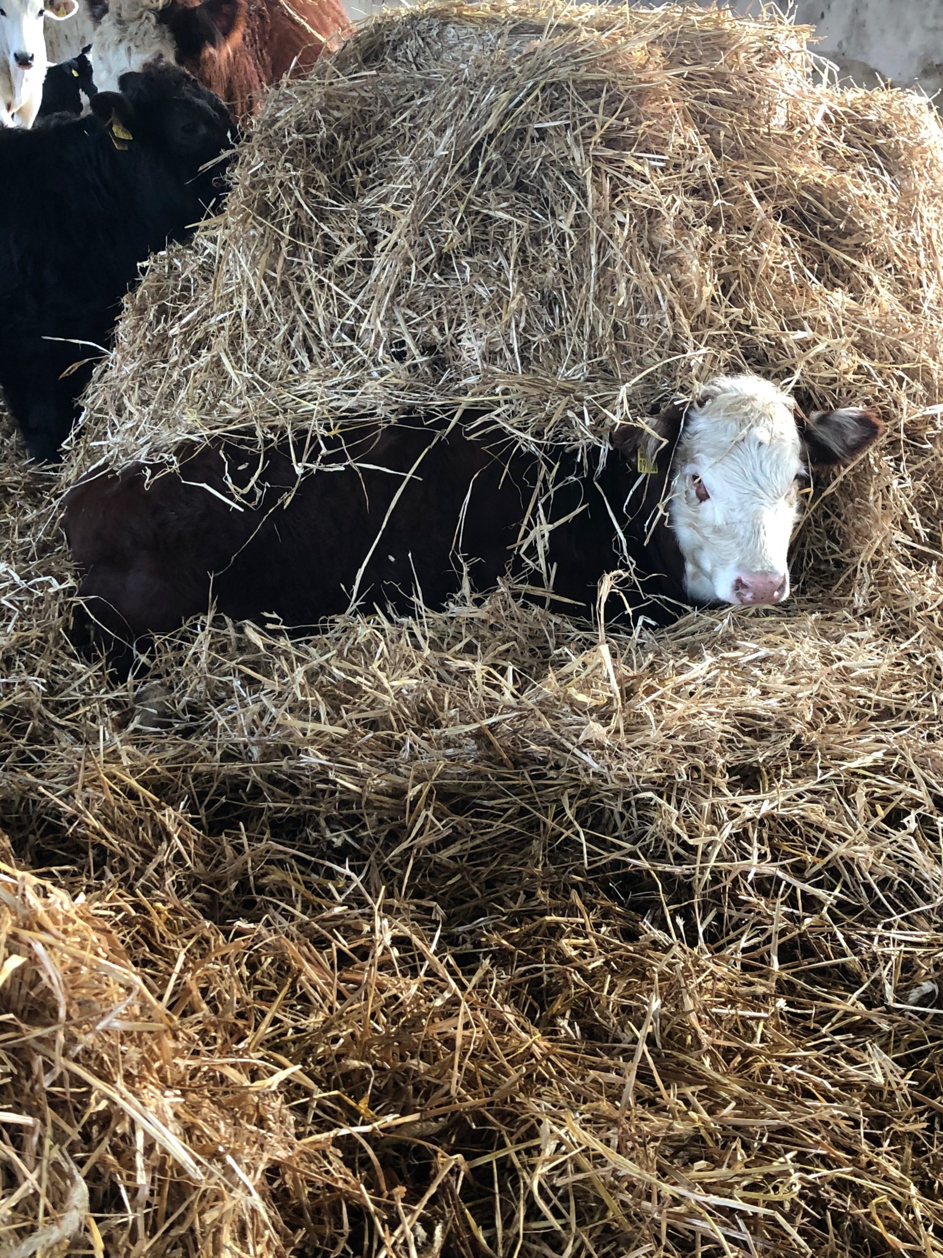 Es gibt keine Mastphase. Ich weigere mich (auch wenn es nur wenige Monate sein sollten) ihren Platz und ihre Sozialkontakte zu beschränken. Sie leben einfach so lange, wie sie brauchen (fieser Satz eigentlich…), um schlachtreif zu sein. Und das dauert bei Heu, Heulage und Stroh eben auch länger. Ausser Mineralien gibt es kein Zufutter. Dass ich damit nur selten sehr fette Tiere habe, ist dann so. Auch dass meine Tiere tendenziell immer etwas fester im Fleisch sind – auch das ist der Haltung und der Bewegung „geschuldet“