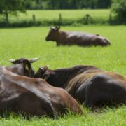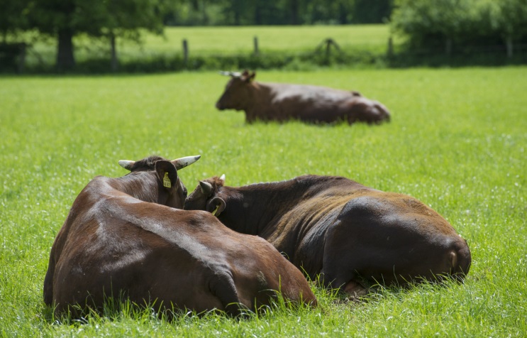 Die Bunten Bentheimer Schweine des Hofes leben ganzjährig in Freilandhaltung, wobei sie ein großer Familienstall vor Kälte, Regen und Schnee schützt. Zum Abferkeln kommen die Sauen in einen frisch eingestreuten Abferkelstall, in dem sie weder angebunden noch fixiert werden. Die Mutterkuhherde, bestehend aus 21 Kühen mit Kälbern der Fleischrassen Charolais, Blond d’Aquitaine und rotem Höhenvieh, verbringen die Sommermonate (meist von April bis November) auf der Weide und kommen den Winter über in einen Strohlaufstall mit Aussenauslauf. Alle Tiere werden mit hofeigenem Getreide, Mais und Kleegras gefüttert. Durch die tier- und artgerechte Haltung mit Auslauf, Weidegang, Stroh und sehr viel Platz sind alle gesund, vital und robust.
