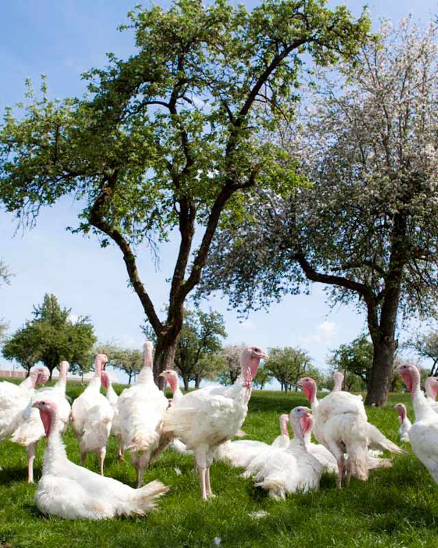 Die Fütterung geschieht mit betriebseigenem Futter wie Heu, Silage, frischem Gras und Stroh. Der Boxenstall mit ganzjährigem Auslauf und Sommerweidegang – im Wechsel mit den Puten – bietet ein ideales Zusammenspiel.
