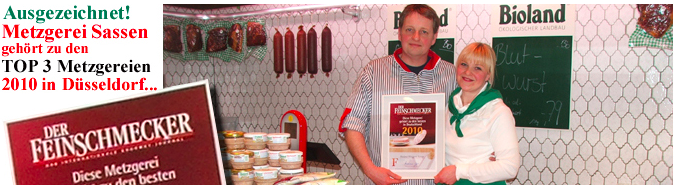 Die Bioland-Metzgerei Sassen bietet das komplette Sortiment an. Das heißt, Bioland-Rindfleisch, Bioland-Kalbfleisch, Bioland-Schweinefleisch, Bioland-Lammfleisch und Bioland-Geflügel. Die Metzgerei Sassen wurde erneut ausgezeichnet und gehört auch 2015 in Düsseldorf zu den TOP-Metzgereien und in Deutschland zu den 400 besten.