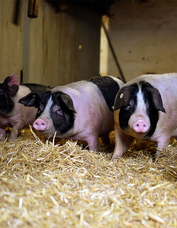 Großzügige Stallhaltung auf Stroh der Schweine ansonsten Freiland- und Weidehaltung