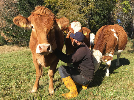 Zur Aufzucht und Haltung der Tiere: Unsere Kälber haben von Geburt an eine enge Beziehung zu Ihren Müttern. Die Kuh säugt es rund acht Monate lang mehrmals täglich. Und wir leben daher mit den Jahreszeiten: Während die Kälber im Stall von den Müttern genährt werden, kann sich draußen die Vegetation auf den Weiden erneuern. Unsere kleinen Gipfelstürmer haben im Stall die Möglichkeit, sich in einen sogenannten „Kälberschlupf“ zurückzuziehen. Im Frühjahr dürfen die Kälber dann erstmals mit ihren Müttern in mehreren Herdenverbünden aus je bis zu 20 Muttertieren und einem Bullen auf die Weide, wo sie dann den gesamten Sommer über Tag und Nacht verbleiben. Erst im November ziehen die Herden wieder in den großzügigen Laufstall ein.